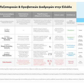 Πρόκειται για μια ενιαία κατάταξη που καλύπτει όλο το φάσμα πεζής κίνησης στην ελληνική επικράτεια -από το απλό περπάτημα έως τον αλπινισμό- σε πέντε επίπεδα (E). Σε μια περίοδο όπου όλο και περισσότεροι σύλλογοι και δημόσιες αρχές προχωρούν σε σήμανση και συντήρηση διαδρομών και μονοπατιών, θεωρούμε ότι μια τέτοια κοινή γλώσσα μπορεί να συνεισφέρει στη δημιουργία ενός εθνικού συστήματος κατάταξης.